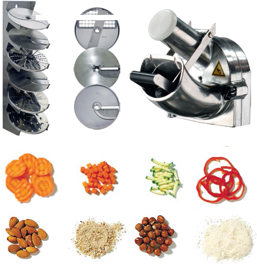 Raffelt, reibt und schneidet Scheiben, Julienne, Pommes-Frites und Würfel. Saubere, einwandfreie Schnittqualität. Äusserst kräftiger Antrieb mit stufenloser elektronischer Drehzahlregelung erlaubt das schnelle Verarbeiten selbst von schwierigen Produkten.