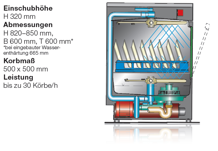 Durchschubmaschine UPster® H spült dank Programmstartautomatik nicht nur mit voller Power, sondern auch mit bestem Komfort. Das Kraftpaket macht Dampfschwaden und schlechtem Klima in der Spülküche Beine und dank der Einschubhöhe von 440 mm auch Platten, große Teller und Tabletts. Was will man mehr?