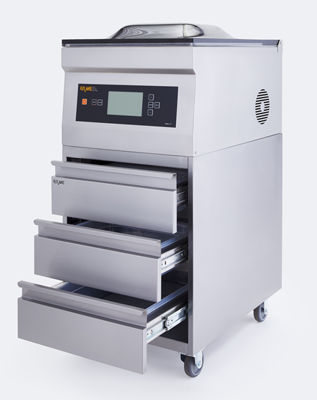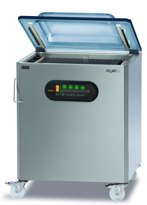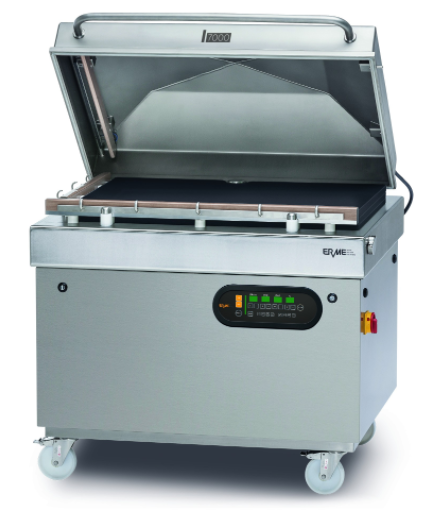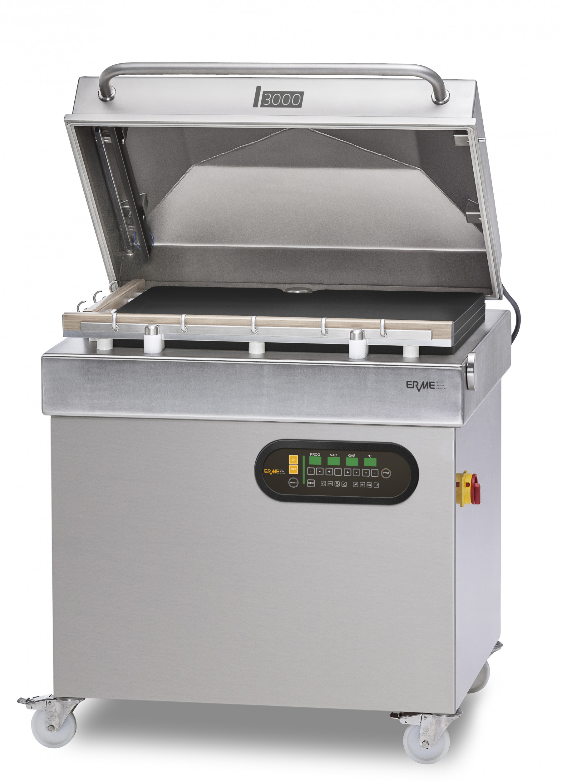 Unsere leistungsstarken Grosskammermaschinen, komplett aus rostfreiem Stahl gefertigt, entsprechend Ihren Anforderungen. Ob Metzgereibetrieb oder Produktionsküche, diese Modelle mit neuer Steuerung und optionaler Schutzgaseinrichtung kommen allen Anforderungen an die Verpackung nach. Als ERME Standard wird das Modell mit drei Siegelbalken geliefert.