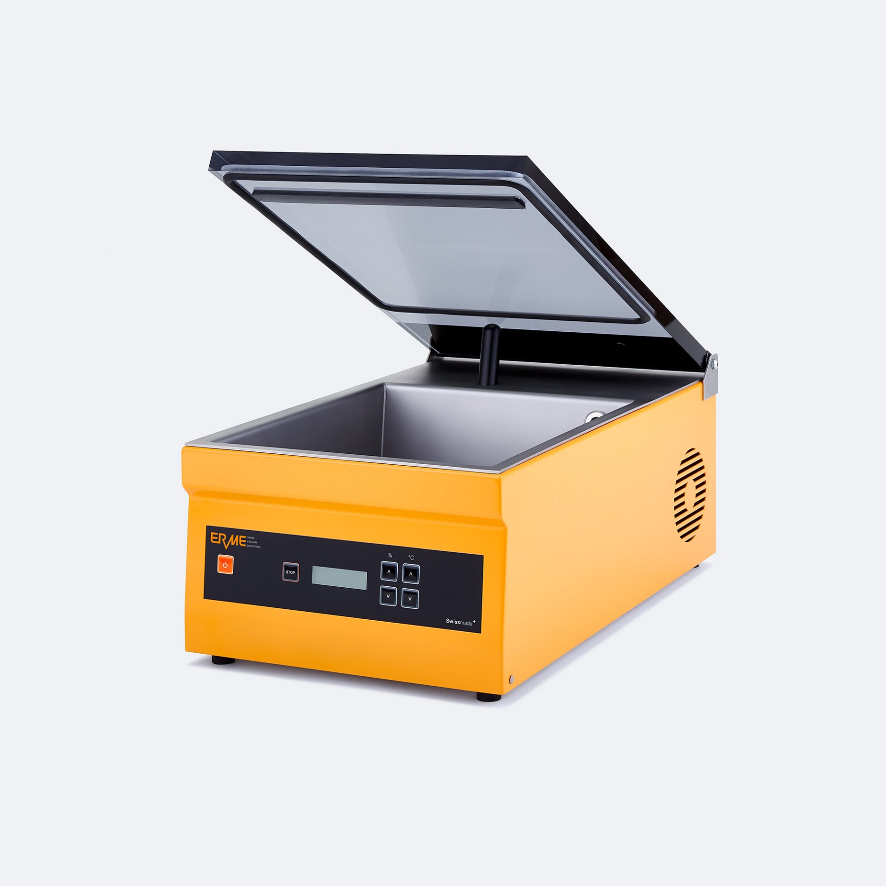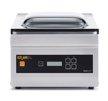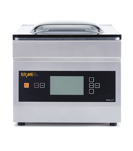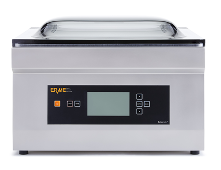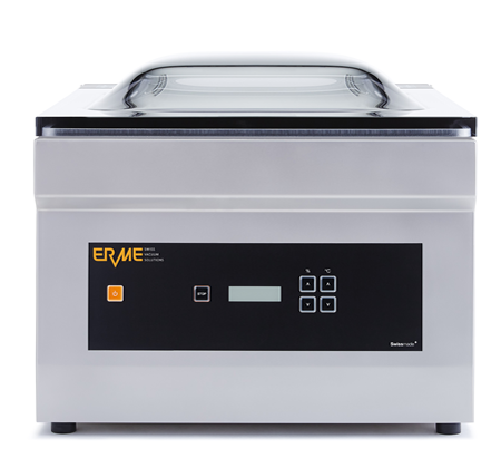 ie ERME P-Serie – P für Professional – wurde speziell für Betriebe mit erhöhten Ansprüchen an Effizienz, Leistung und Bedienungskomfort entwickelt. Letzteres ermöglicht die neu entwickelte ERME Mikroprozessor-Steuerung. Zusätzliche Vorteile sind das grosse Display, eine individuelle Programmiermöglichkeit, die geräuscharme Pumpe sowie Green Vac und Schutzgas-Kompatibilität. Weitere Optionen sind verfügbar. Auch diese Typenreihe verfügt über ein Gehäuse aus Edelstahl, eine Doppel-Trennschweissung, Dampferkennung und den praktischen Vakuum-Stopp.