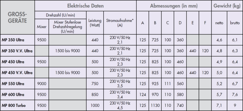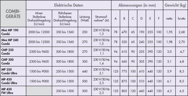 - Mini MP 190: Mixer: 2000 bis 12500 U/min Rührbesen: 350 bis 1560 U/min