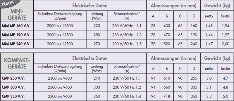 - MP 350 V.V./MP 450 V.V. :1500 bis 9000 U/min